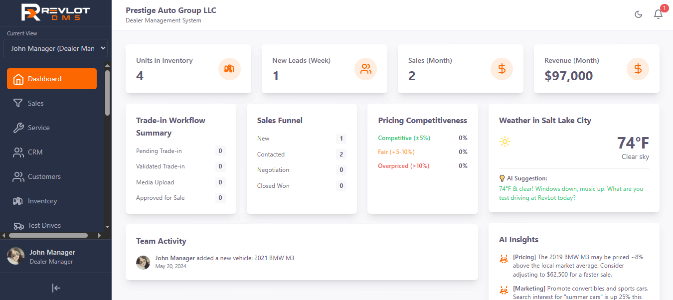 Revlot DMS is the ultimate Dealer Management System designed for modern dealerships. From lead management, inventory control, service scheduling, and sales tracking, to real-time financial reporting, everything is connected in one easy-to-use system.